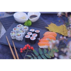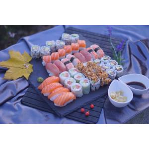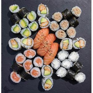 3 sushis saumon et assortiments de 8makis saumon, 8 avocats, 8 thon mayonnaise, 8 fromage.