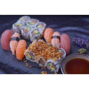 4 Sushis Thon, 4 Sushis Saumon, 4 Sushi Crevette, 6 California Sésame Saumon, 6 California Sésame Thon Mayonnaise, 6 California Crispy onions Poulet Mayonnaise, 6 Spring rolls Saumon Fromage Frais, 6 Rolls Saumon